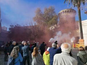 A continuació s’ha realitzat l’encesa de fum, a càrrec dels Mansuets de Foc, a peu de torre. Fum simbòlic, símbol d’amistat.