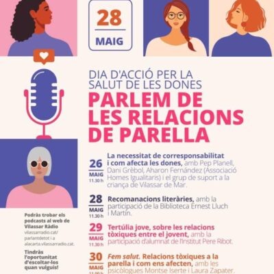 “Parlem de les Relacions de Parella”. Sota aquest títol Vilassar de Mar commemora el Dia Internacional d’Acció per la Salut de les Dones, amb un cicle dedicat a les relacions de parella. Es tracta d’un seguit de quatre espais radiofònics que tracten diferents aspectes relacionats amb la salut emocional i les relacions afectives.