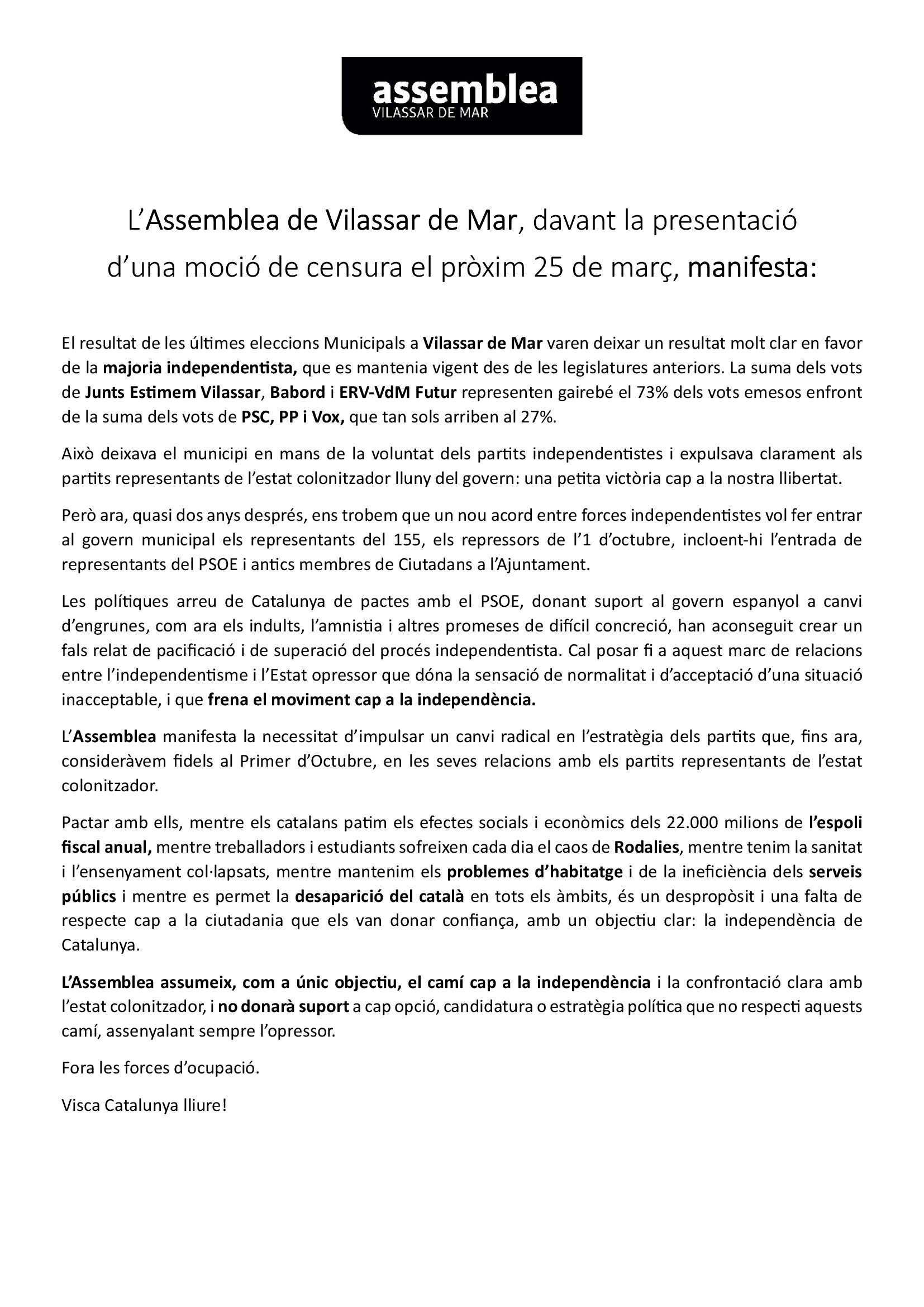 L’Assemblea Nacional Catalana de Vilassar de Mar ens ha fet arribar un comunicat de premsa en què ha mostrat el seu desacord amb la moció de censura de Babord, ERC-VdM Futur contra el govern de la nostra localitat, en mans de Junts Estimem Vilassar de Mar, ja aquest preacord de moció de censura posa el govern del nostre municipi, a parer de l’ANC, “a les mans del 155”.